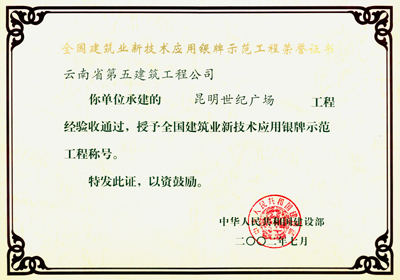 世紀(jì)廣場(chǎng)銀牌示范工程證書(shū)
